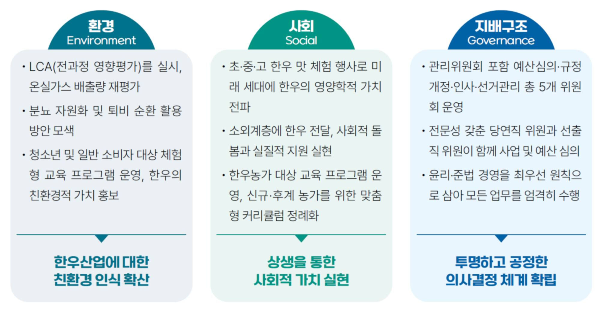 ESG는 환경(Environment), 사회(Social), 지배구조(Governance)를 아우르는 지속가능경영의 기준으로, 단순한 경영 트렌드를 넘어 기후위기 대응, 사회적 신뢰 확보, 장기적인 가치 제고 등을 위해 전 세계적으로 적극 도입되고 있다. 한우산업에서도 ESG는 지속가능성과 소비자 신뢰 확보를 위한 핵심 가치로 부상하고 있으며, 한우자조금은 책임 있는 생산, 공정한 유통, 투명한 운영을 원칙으로 ESG 전략을 선도적으로 실행해 한우산업의 체질을 개선해 나갈 계획이다.