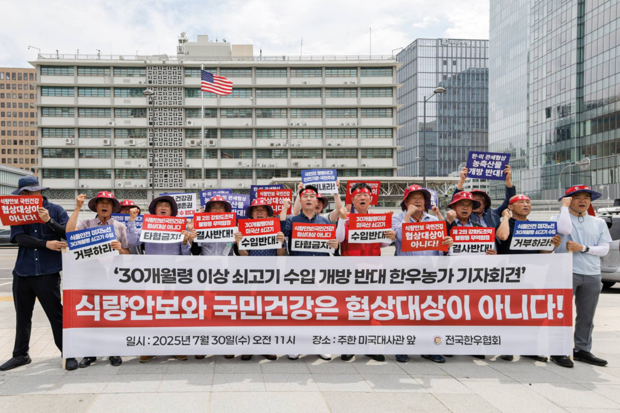 ▲ 전국한우협회는 7월 30일 주한 미국대사관 앞에서 30개월령 이상 미국산 소고기 수입 압박에 대해 규탄했다