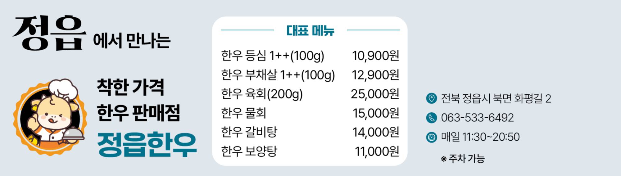 전북 정읍시 북면에 자리한 ‘정읍한우’는 이름 그대로 지역 대표 맛집이자 한우의 본질을 지키는 정육식당이다. 전북한우육종협동조합이 운영하며, 100년간 소를 길러온 400여 한우농가가 우수 혈통만을 선별하고, 사육부터 출하 시기까지 철저히 관리한다. 여기에 20일 이상의 숙성을 거친 한우만을 제공해 맛과 품질을 끌어올린다. 정성이 담긴 한우를 합리적인 가격에 만날 수 있다는 점도 이곳의 매력이다. 서울·수도권 대비 약 20% 저렴한 가격 덕분에 멀리서 찾아오는 단골도 많다.