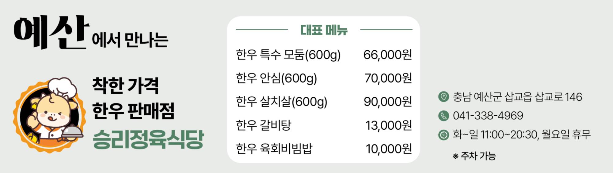 2008년 정육식당으로 시작해 아버지의 노하우를 이어받은 아들이 운영하는 승리정육식당은 세월과 경험이 쌓인 만큼 안정적인 맛과 푸짐한 양으로 손님들의 발길을 끈다. 이곳의 인기 메뉴는 다양한 부위를 한 번에 맛볼 수 있는 특수모둠이다. 등심, 업진살, 부채살, 제비추리, 차돌박이 등 고급 부위가 골고루 담겨 구이 본연의 풍미를 충분히 느낄 수 있으며, 가격 또한 합리적이다. 식사 메뉴로는 갈비탕과 육회비빔밥이 특히 인기가 높다. 갈비탕은 하루 점심에만 100인분이 나갈 정도로 사랑받으며, 육회비빔밥은 육회만 150g 이상을 올려 일반적인 양의 두 배 수준이다.