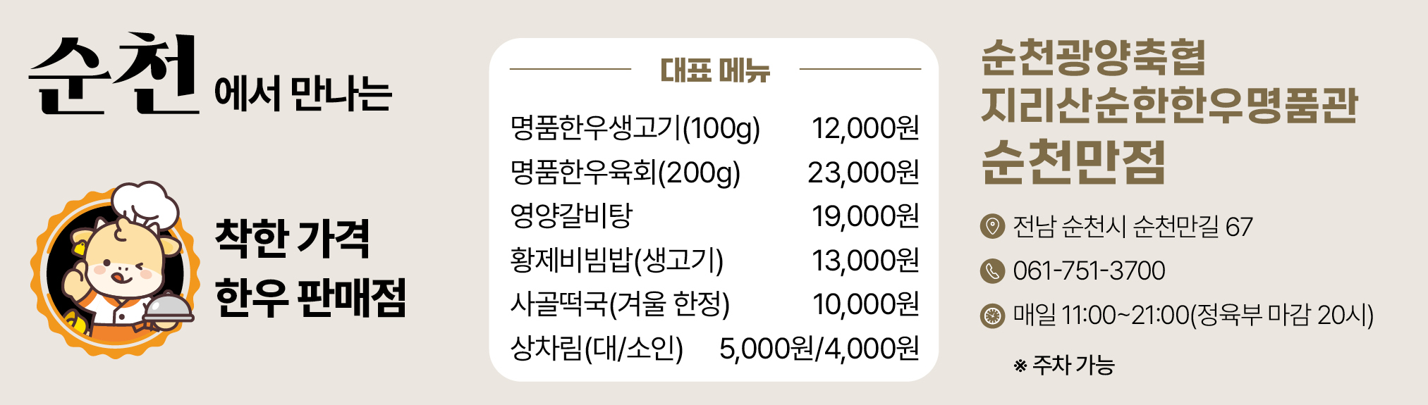 지리산순한한우명품관 순천만점은 17년 동안 변하지 않는 한결같은 맛과 품질로 사랑받아 온 한우 전문식당이다. 총 350석 규모의 대형 매장은 층별로 다른 형태로 운영된다. 1층은 셀프식당으로, 정육마트에서 직접 한우를 고른 뒤 상차림비만 내면 돼 더욱 합리적인 가격에 한우를 즐길 수 있다. 2층은 모두 단독룸으로 구성되어 있으며, 4인부터 40인까지 다양한 인원에 맞는 독립된 공간을 갖춰 가족 외식이나 단체 모임에도 제격이다.