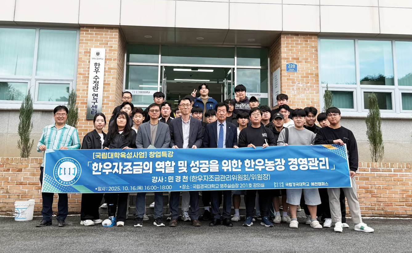 민경천 한우자조금관리위원장은 10월 16일 국립경국대학교에서 ‘한우자조금의 역할 및 성공을 위한 한우농장 경영관리’를 주제로 특강을 진행했다. 이번 특강은 지역 축산전공 대학생들에게 한우산업의 구조와 현황을 소개하고, 한우농장 창업과 경영관리의 실전적 이해를 돕기 위해 마련됐다.