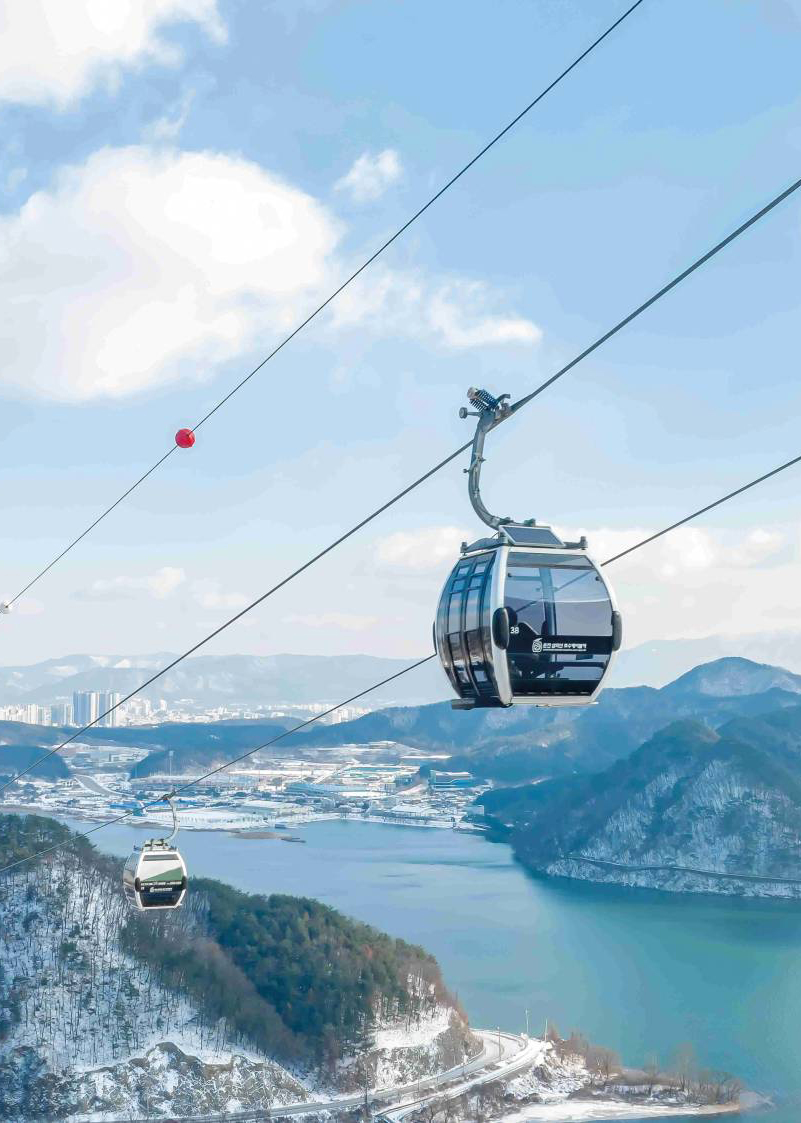 춘천의 푸른 심장, 의암호를 가로질러 삼악산의 품으로 향하는 특별한 하늘길이다. 삼천동에서 의암호를 지나 삼악산까지 이어지는 3.61km의 국내 최장 길이 케이블카로 호수와 산, 그리고 도심이 어우러진 비경을 파노라마로 선사한다. 특히 바닥이 통유리로 된 ‘크리스털 캐빈’에 오르면 발아래로 일렁이는 물결이 그대로 비쳐 마치 물 위를 걷는 듯한 아찔함을 느낄 수 있다. 상부 정차장에 도착하면 탁 트인 통유리 카페가 여행자를 맞이하고, 산책로를 따라 10분 남짓 걸으면 스카이 워크 전망대에 닿는다. 한 폭의 수채화처럼 펼쳐지는 시내를 눈에 담으며 호수 위를 유영하듯 흐르는 시간 속에서 춘천의 진면목을 발견하게 된다.
