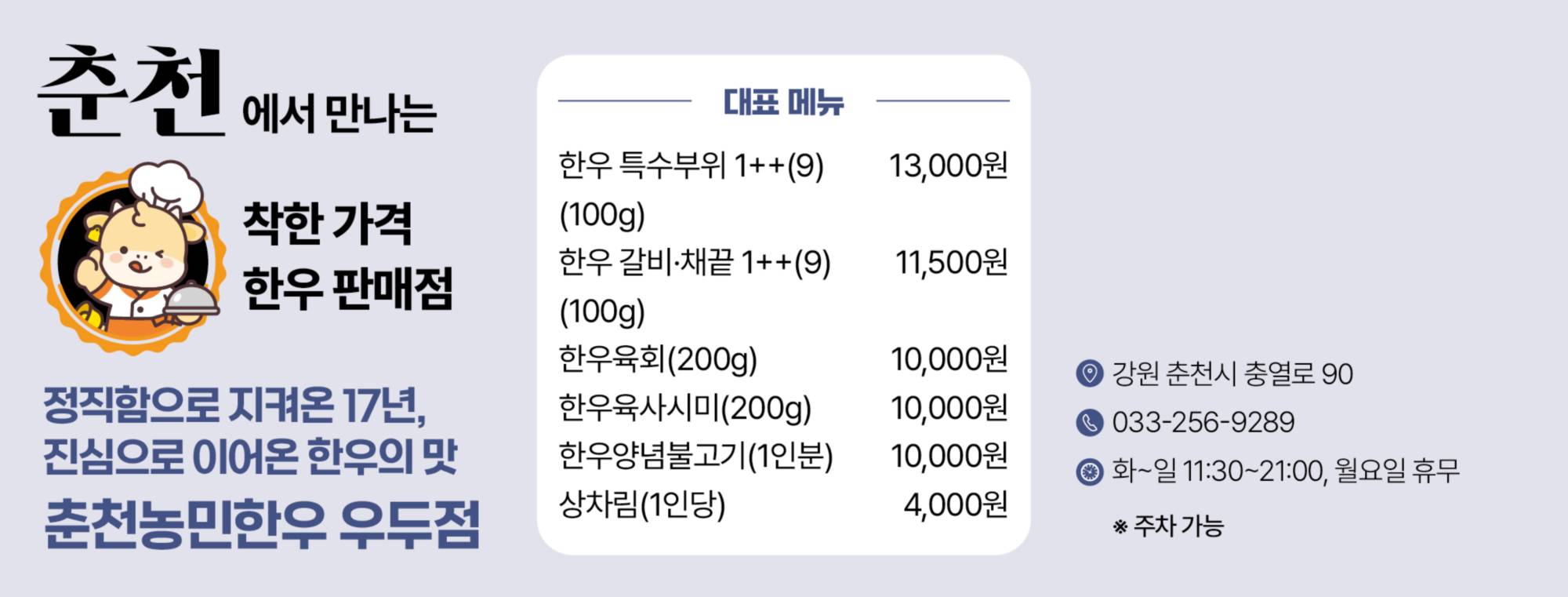 춘천농민한우 우두점은 2009년 춘천 지역의 일곱 개 한우 농가가 힘을 모아 문을 연 한우 전문 정육식당이다. 현재는 총 21개 농가가 참여해 한우를 안정적으로 공급하고 있으며, 이를 기반으로 지속적인 품질 관리와 공급 체계를 강화해 나가고 있다. 또한 이러한 안정적 공급 시스템을 토대로 등급별 특성을 반영한 다양한 가격대를 마련해 고객이 취향과 예산에 맞춰 합리적으로 선택할 수 있도록 하고 있다.